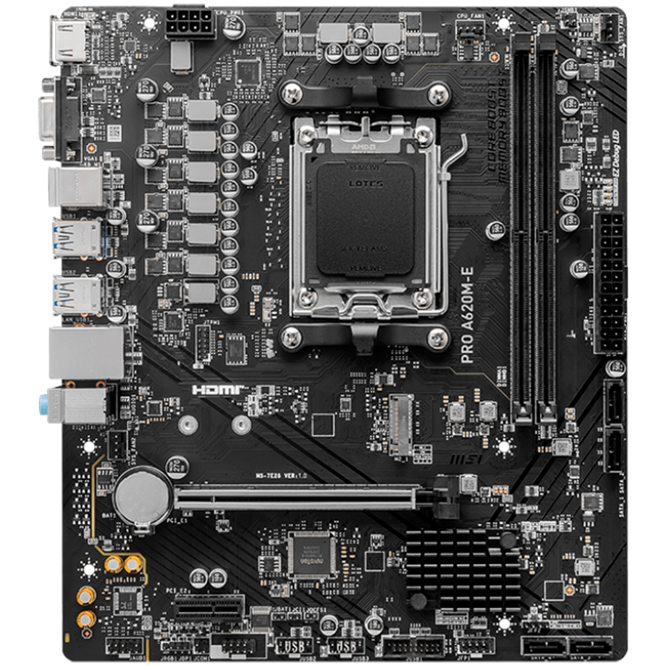 MSI PRO A620M-E, mATX, Socket AM5, Dual Channel DDR5 6800+MHz, 1x PCIe x16 slot, 1x M.2 slot, 1x HDMI, 1x VGA, 2x USB 3.2 Gen 1, 4x USB 2.0, 7.1 HD Audio, Realtek RTL8111H Gigabit LAN, 3Y