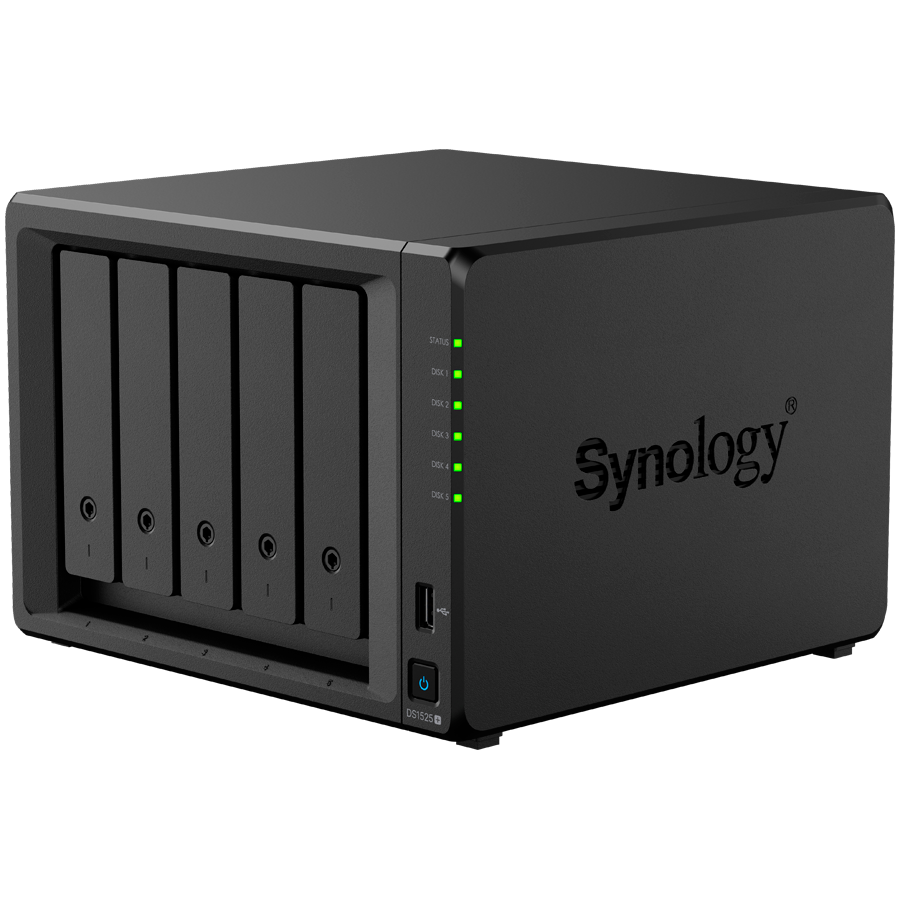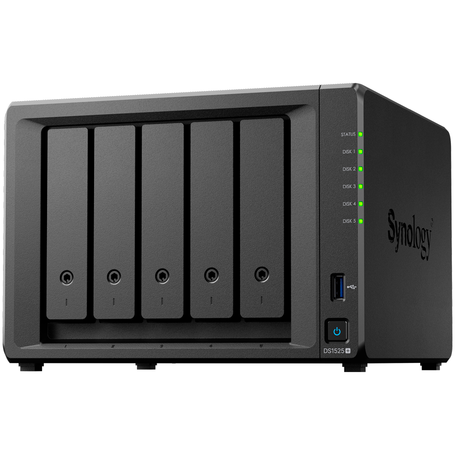 Synology DiskStation DS1525+ Tower, 5-Bays 3.5” SATA HDD/SSD, 2 x M.2 2280 NVMe SSD slot, CPU AMD Ryzen V1500B 4-core 2.2 GHz, 8 GB DDR4 ECC SODIMM, 2x RJ-45 2.5 GbE LAN Port; 2x USB 3.2; 1 xUSB Type-C expansion port; 2.67 kg; 3yr warranty