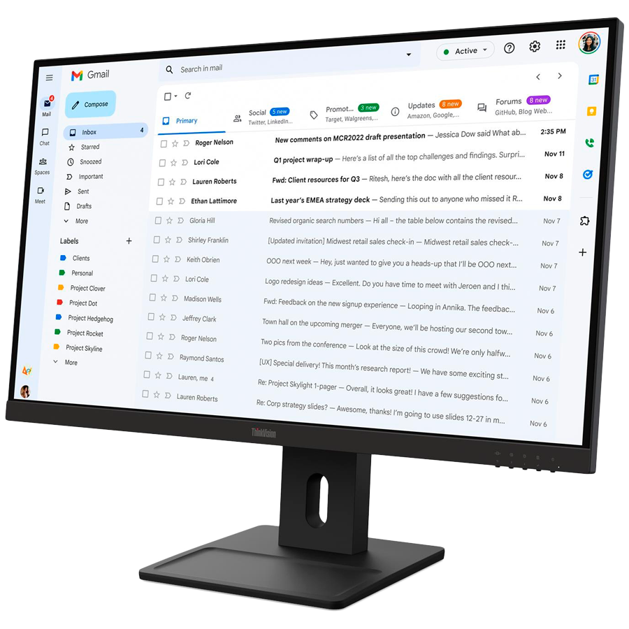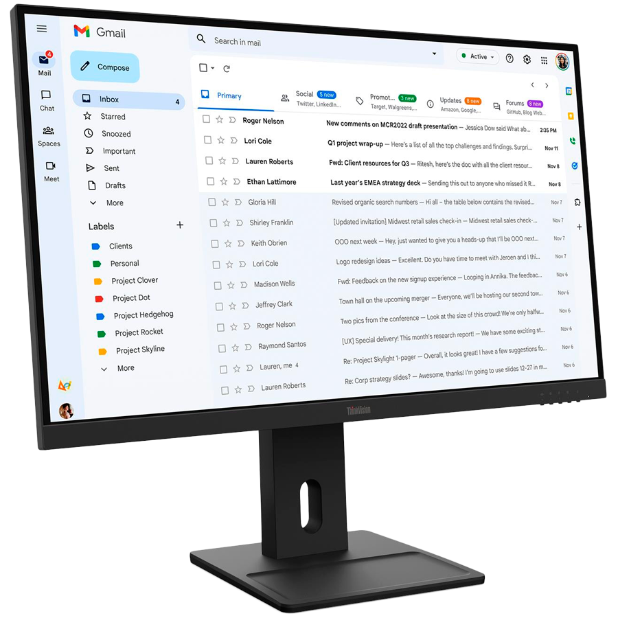 ThinkVision E27-40, 23.8” IPS, 1920×1080 FHD, 1500:1, 300 nits, 100Hz, 178 / 178, 16:9, 4/6ms, HDMI, DP, VGA, 2x 2w, Tilt, Swivel, Pivot, Height Adjust Stand, VESA, Raven Black, 3Yr